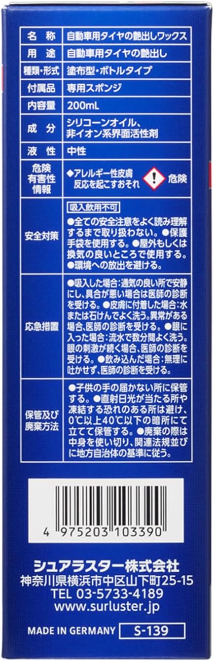 SurLuster(シュアラスター) タイヤワックス 200ml 水性 塗りこみ タイヤの艶出し 保護 ひび割れ防止 シリコーンオイル 乳液タイプ スポンジ付き 中性 S-139