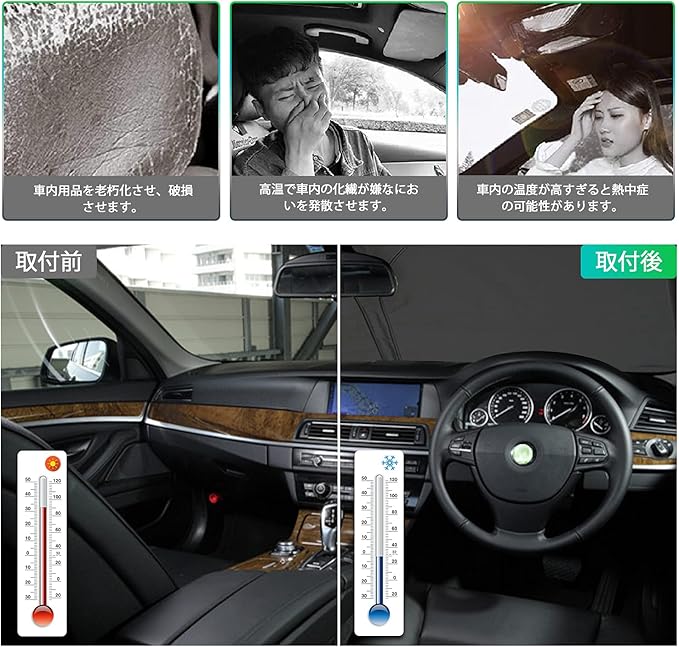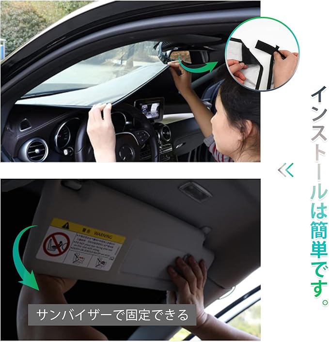 【取付簡単】サンシェードを広げて、サンシェードの靭性を利用して車のフロントガラスに取り付け、サンバイザーで挟んで固定すればいいです。あまり時間をかけなくても、初心者でも取付ができます。また、サンシェードは記憶機能のある筋金で作られていますので、収納も簡単で、車内の使用空間を占用することもなく、再使用しても変形しません。