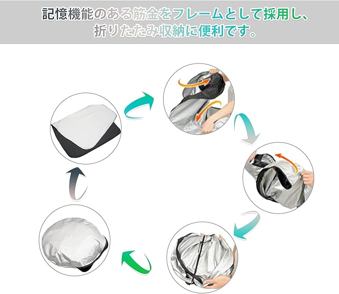 【材質・構造】高密度アルミメッキ反射層・ポリウレタン耐熱断熱層・UVチタン銀コーティング断熱層・ナノ断熱遮光素材。4層構造を採用し、4つの異なる材質が共同でサンシェードの反射層と断熱層を構築し、夏の日差しの猛烈な照射を遮断させ、車内の温度を減らすことができます。また、99%以上の紫外線の侵入を効果的にカットし、健康を守ることができます。高品質・高密度のナイロン布を使用して作られ、軽量で耐久性に優れています。