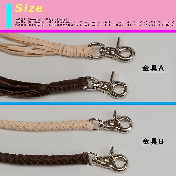 【サイズ(詳細)】:①革部分(500mm)・革太さ(10mm)、②金具A(H:58mm)・革と金具Aとの結合リング(W:20mm)・レバーナスカン(H:43mm)/カン部分(H:22mm)、③金具B(H:51mm)・革と金具Bとの結合リング(W:16mm)・レバーナスカン(H:38mm)/カン部分(H:18mm)