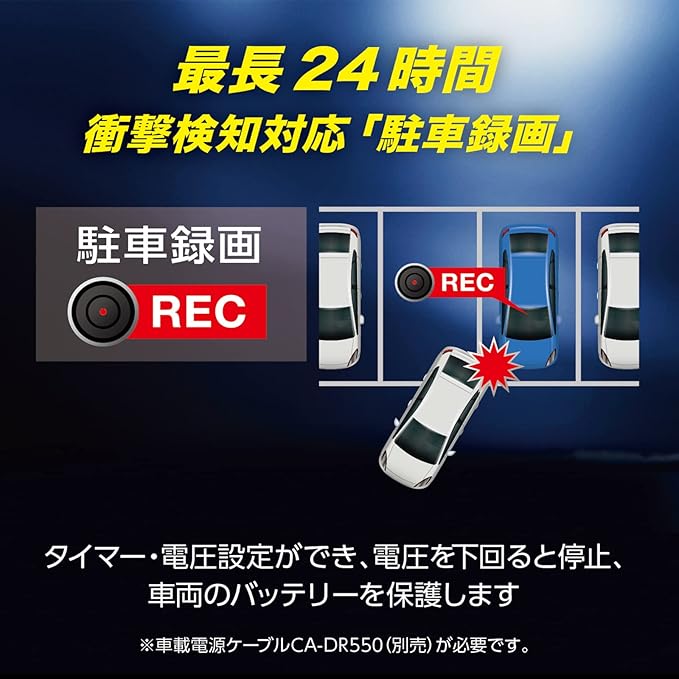 幅広い車種に装着可能なバンド式装着・SDカードメンテナンスフリー・前後カメラにWDR搭載・Windows/Mac対応専用PCビューアソフト・スーパーキャパシター搭載・車載電源ケーブルCA-DR550(別売)使用で、最長24時間衝撃検知の駐車録画可能。