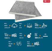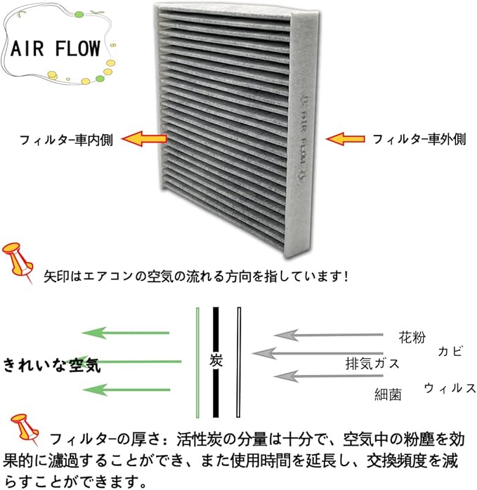 【活性炭入り】:活性炭の表面は無数の小さい孔があって、小さい孔の直径の大部分は2~50 nmの間で、比較的に強い吸着の効果があって、活性炭は空気を浄化する中でとても大きい作用を発揮することができて、肉眼で見分けられない有害物質を除去して、車内の空気の品質を改善させます。特殊3層構造、安定風量性能できれいな空気の流れでエアコン効率もアップです、同時に気持ちをもっと楽しくなります。