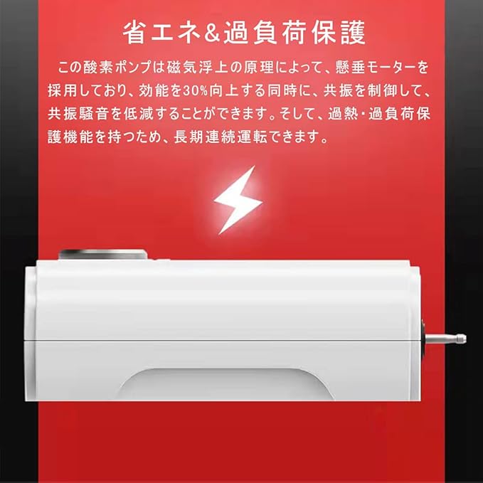 ◆【省エネ&過負荷保護】◆この酸素ポンプは磁気浮上の原理によって、懸垂モーターを採用しており、効能を30%向上する同時に、共振を制御して、共振騒音を低減することができます。そして、過熱・過負荷保護機能を持つため、長期連続運転できます。最大の使用時間は3~7年間を維持できます。