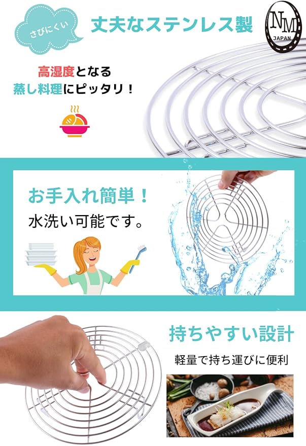 【 丈夫なステンレス鋼製 】 「N.M.JAPAN」製の蒸し台は、丈夫なステンレス鋼製となっております。さびにくいため、高湿度となる蒸し料理のアイテムとして最適です。また耐久性に優れているため、壊れにくく安心して長くご利用頂けます。水洗い可能ですので、お手入れもお手軽にしていただき、いつまでも清潔に保つことが可能です。軽量ですので持ち運びにも便利です。