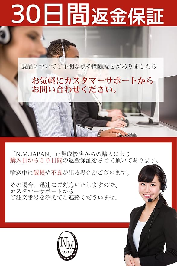 【 30日間のメーカー保証付き! 】 本製品には、「N.M.JAPAN」正規取扱店からの購入に限り購入日から30日間の返金保証をさせて頂いております。迅速にご対応いたしますので、カスタマーサポートからご注文番号を添えてご連絡くださいませ。また、製品についてご不明な点や問題などが御座いましたら、お気軽にカスタマーサポートからお問い合わせください。