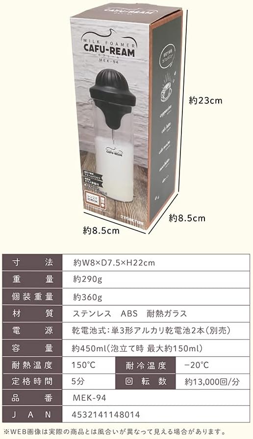 サイズ:w8*d7.5*h22cm(ガラス容器17cm 450ml )、材質:ステンレス、ABS、耐熱ガラス、 電源:単3アルカリ乾電池 2(別売)、 回転数:13,000/分