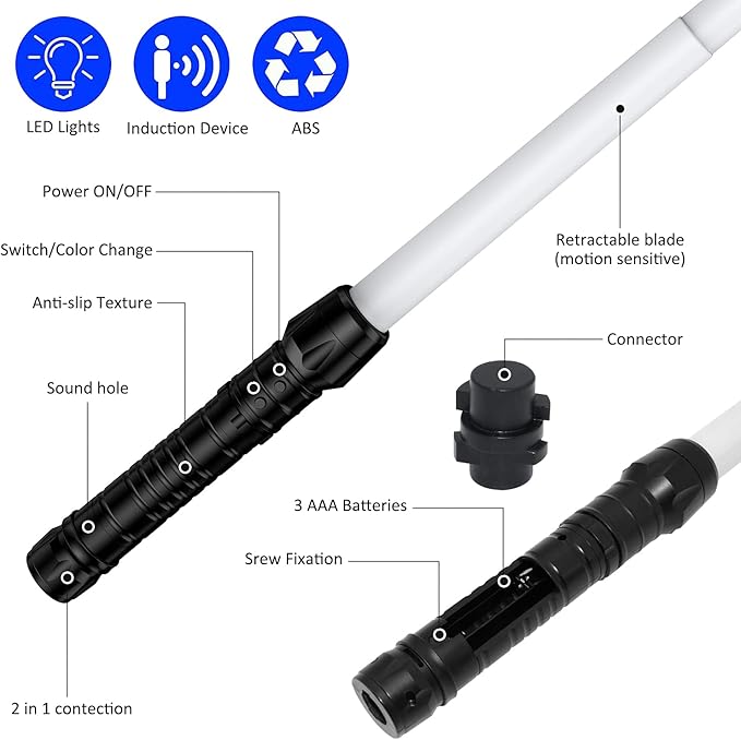 [拡張可能&2イン1] - 2イン1ライトセーバーセットには、2本の剣とコネクタが含まれています。 ライトセーバーは3段階のデザインで、握りやすいデザインハンドルが付いており、伸縮・折りたたみ可能 (長さ16.9インチから31.9インチまで拡張)。 大人/子供でも簡単に収納・持ち運びができます。