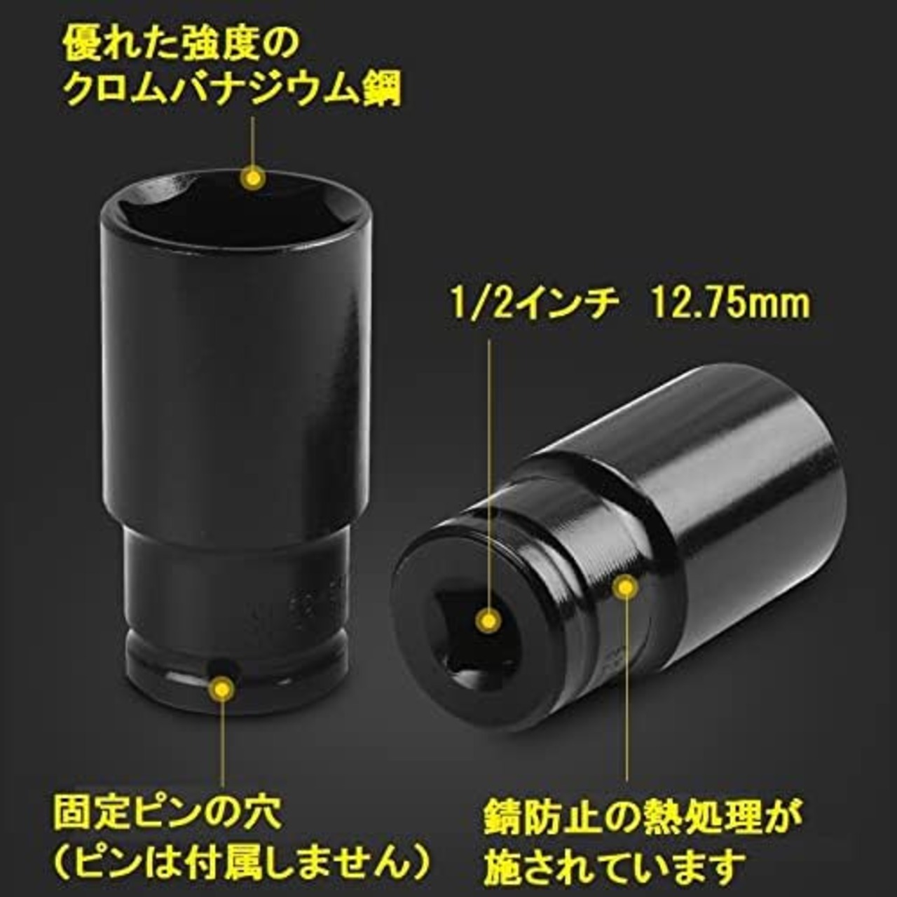 差し込みサイズ:1/2”(12.7mm)エアーインパクトなどにも対応の1/2インチです。もちろん手動のソケットレンチでも使えます。
