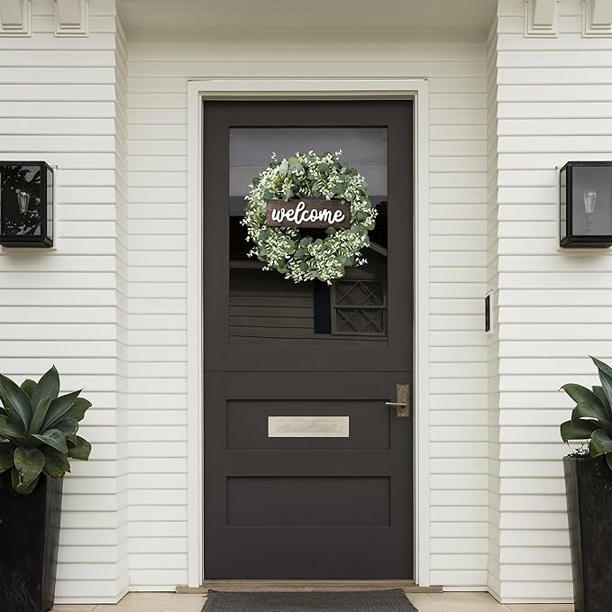 Sggvecsy 人工ユーカリリース ウェルカムサイン付き グリーンユーカリリーフリース 16インチ グリーリース ラウンドリーフリース フロントドア 壁 窓 フェスティバル ファームハウス ポーチパティオ ガーデン装飾