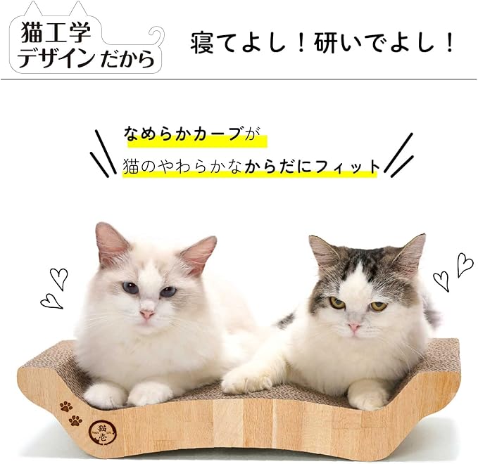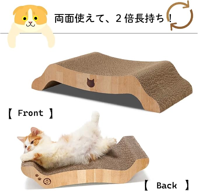 【両面使えて2倍長持ち】バリバリベッドは、両面ともダンボールになっています。片面がボロボロになった後は、反対面と使えるので、長くお使いいただけます。どちらの面も絶妙な角度のカーブで猫のやわらかいからだにフィットします。