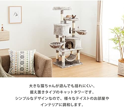 猫ちゃんの運動不足解消に!据え置き型キャットタワー。大きな猫ちゃんが遊んでも揺れにくい、据え置きタイプのキャットタワーです。シンプルなデザインなので、様々なテイストのお部屋やインテリアに調和します。猫ちゃんも大満足の遊び場。【ふかふかベッド】ベッドは上部に2つ。一番高いベッドからは部屋中を見渡すことができます。ふかふかのフランネル素材でできているので寝心地も抜群です。【まったりハンモック】円形のハンモックは猫ちゃんが丸まって入るのにぴったり。角度が自由に変えられるので、猫ちゃんの好みやお部屋に合わせてお使いいただけます。下部にもハンモックがあるので、遊び疲れた猫ちゃんもゆっくりと休めます。