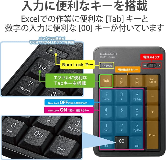 本格静音設計で音が気になる場所や時間帯での使用に最適。さらに、日々のパソコン操作に安心をプラスする抗菌仕様。 USBポートを塞がずにワイヤレス接続できるBluetooth(R)静音テンキーパッド。