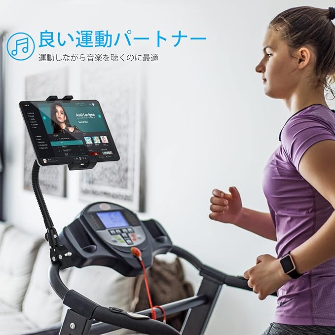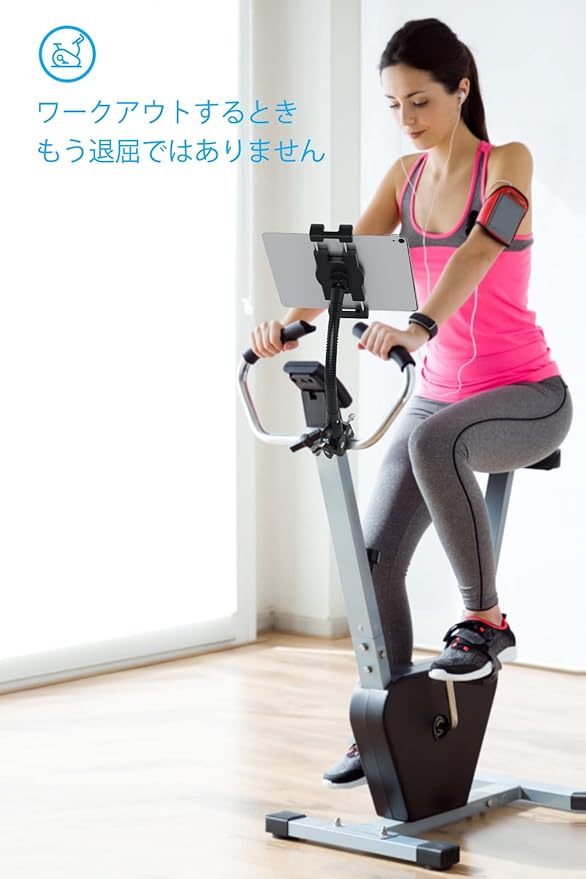 [360 自由回転] 完璧な視角(水平、垂直、任意の角度)に合わせてiPadスタンドを自由に調整できます. 360 回転可能で、90 上下に調整できます。 フィットネス指導ビデオ、テレビ番組、映画、音楽鑑賞、ハンズフリー通話など、さまざまな場面に適しています, 室内サイクリングに最適です.