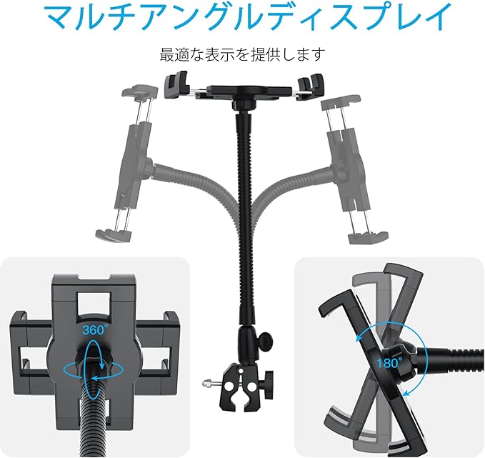 woleyi グースネック フィットネスバイクタブレットホルダー スピンバイクタブレットスタンド 重型フレキシブル250mmスーパーロングアーム トレッドミル取り付け 360度回転 自由調節 日本語説明書付き 対応機種4-13インチデバイス iPad Pro 12.9 11 10.5 9.7 / Air Mini 5 4 3 2 / iPhone 13 / 13 Pro / 12 / SE