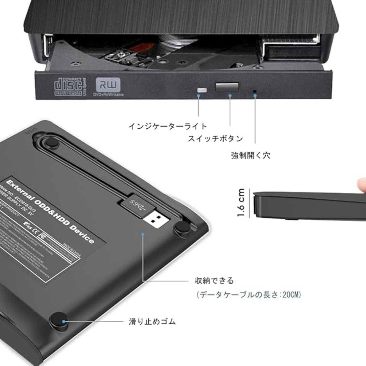 外付けdvdドライブ USB 3.0 type-c CD/DVD読込み・録画込み・書込 CD/DVDプレーヤー 外付け光学ドライブ 外付CD・DVDドライブ PC外付けドライブ ポータブルドライブ CD/DVDドライブ ノートパソコン DVD RW CD-RW USB3.0/2.0 高速 静音 超スリム 薄型 コンパクト Window/Linux/Mac OS対応 (ブラック)