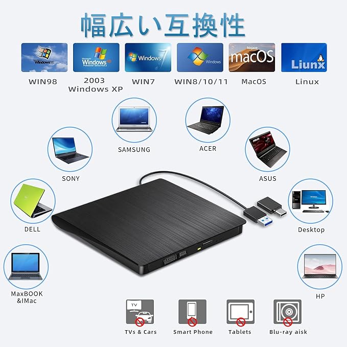 【幅広い互換性】外付けのDVDドライブは、Windows11/Windows10/Win8/Win7/Win XP/Linux/MacOSシステムと互換性があります。内蔵ドライブのないラップトップ/デスクトップ/ Macbookに対応できます。本製品より DVDの映画鑑賞、ソフトのインストール、音楽の再生、ファイルの書き込み、ビデオなどをCD/DVDに書き込みなどをサポートできます。注意:デスクトップパソコンの場合、メインフレーム裏側にあるUSBポートと接続してください。