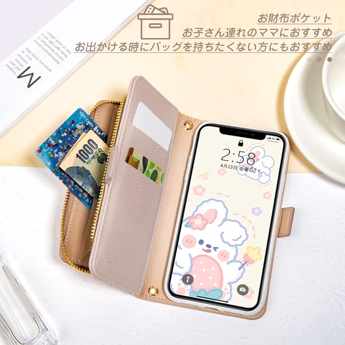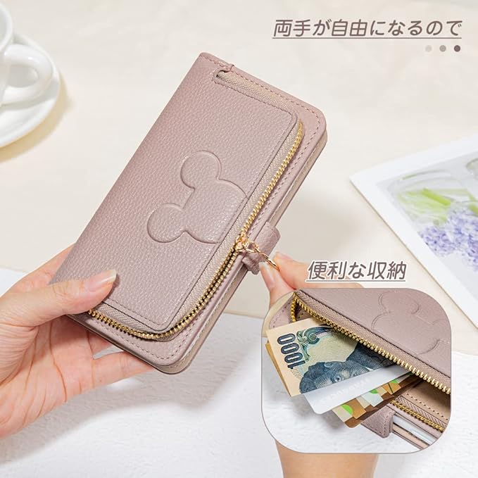 ღ【多機能なデザイン】ショルダーストラップケースの裏にカード入れ二つと表にファスナー付きポケット1つ付きます。お札や名刺、運転免許など収納可能。スタンド機能は長時間の動画視聴にもハンズフリーで楽しめます!