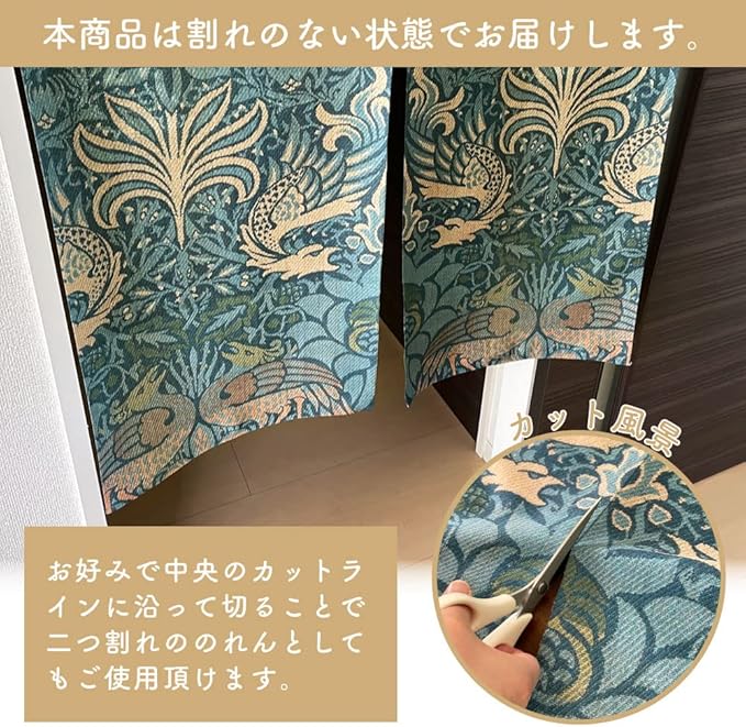 【仕様】割れ目のないのれんです。真ん中のカットラインに沿ってハサミで切り込みを入れることもできます。竿通し部分まで切らないようにご注意ください。直径約2.2cmまでのポール(棒)を通すことができます。 (※つっぱり棒をご使用の場合は、両端のキャップの太さも考慮してください。キャップが取り外せるものもございます。)向こう側の明るい部分がうっすらと透けて見えます。 (光っている電気や、明るい窓の形以外はほとんどわかりません。濃色の部分はやや透けやすいです。)