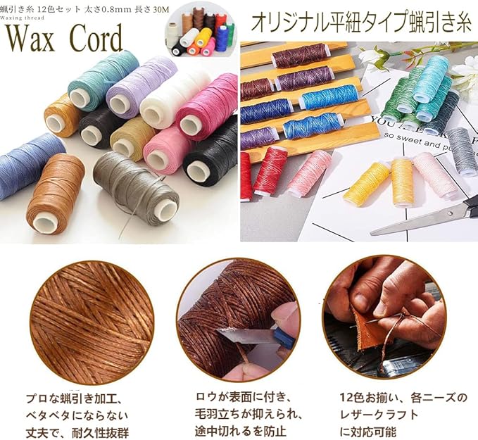 【高品質ワックスコード】 糸の中にしっかりロウが入っているので、通常のナイロン糸より強度も強く無駄に多量のロウが表面についていない為、縫いやすくまた縫った糸の発色も良くなるように加工してあります。麻糸よりもすれに強く、縫った時から毛羽立つような事はないです。