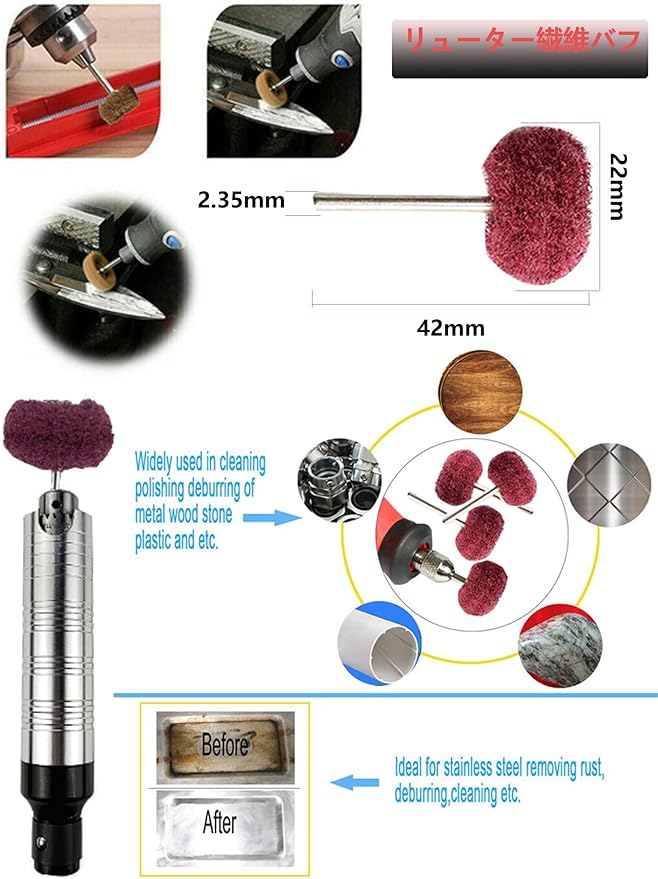 【リューターバフ用途】:汚れ落とし、金属(貴金属)の最終艶出し作業、品質の良いバフを使用し、表面に傷つけることなくソフトに仕上げます。金属表面の洗浄、粉砕、ダスティング、バリ取り、研磨、残留物の除去、酸化物の除去に適す。作業時間を大幅に短縮できるでしょう!