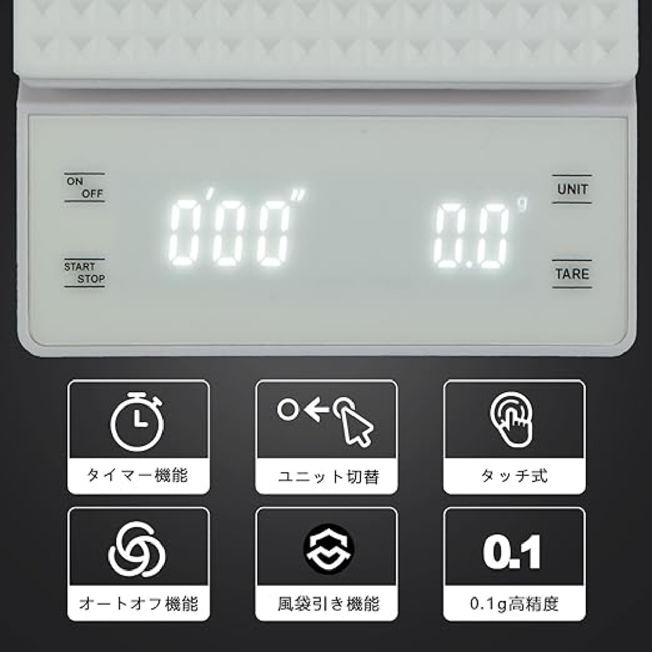 【単位切り替え】重量単位が自由に切り替えれます。UUNITキーを押すごとに表示重量単位のが切り替えます。g(グラム)、OZ(オンス)、ml(ミリリットル)3モードが付きます。