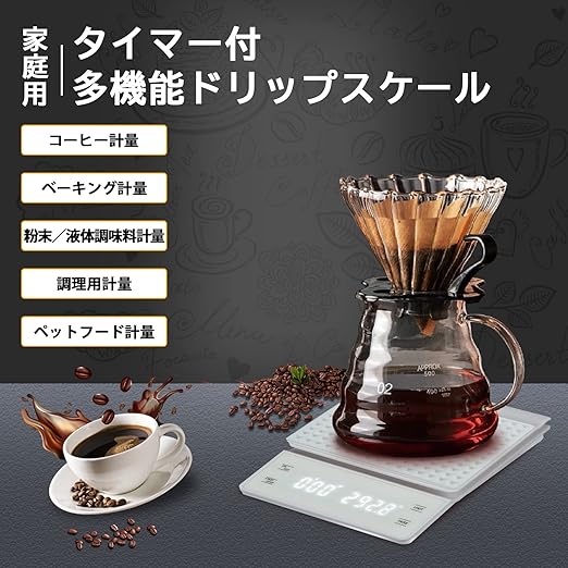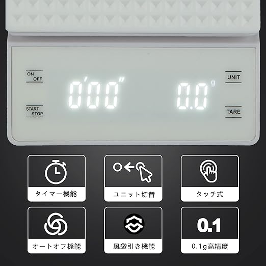 【タイマー機能&風袋引き機能】分秒最大を表示、最大計測時間は99分59秒です。美味しいコーヒーを淹れるには抽出量と抽出時間の測定が不可欠です。風袋引き機能、自動校正、オートパワーオフなどの機能を揃えるデジタルスケールです。