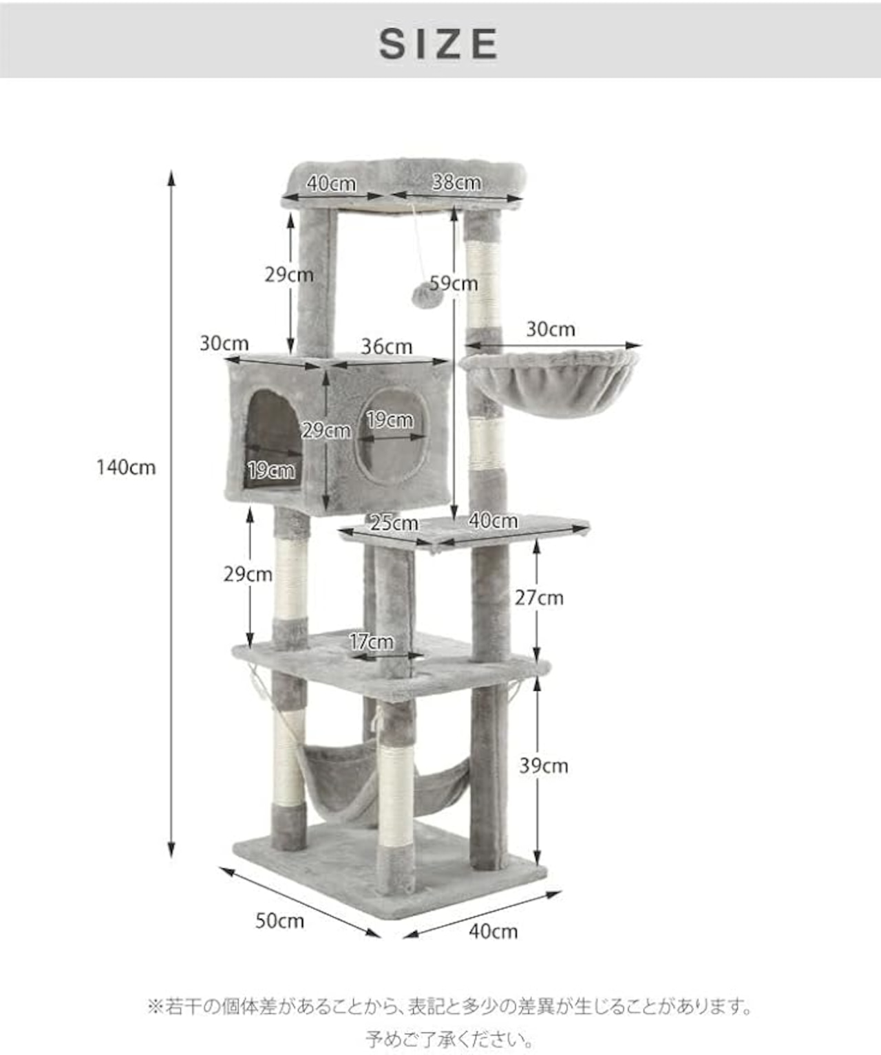 【サイズ】(約)幅40 奥行50 高さ140cm、ハンモック:(約)幅29 奥行38cm【カートンサイズ】(約)幅51cm 奥行き23cm 高さ41.5cm【材質】張り材:ポリエステル100%、板材:パーティクルボード、爪とぎ部:麻縄、支柱芯材:紙【耐荷重】全体:20kg、展望台(ベッド):10kg、ハンモック:7kg、棚板:20kg※サイズには若干の差がございます。※商品の仕様は予告なく変更になる場合がございます。