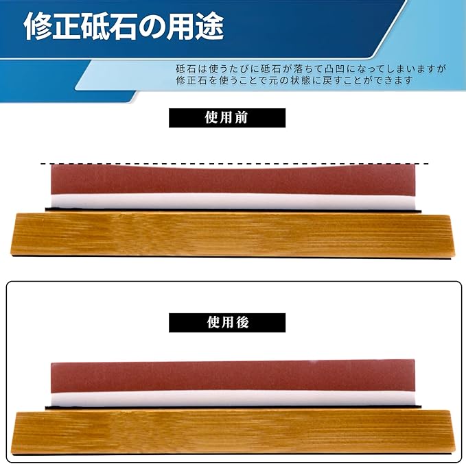 【修正砥石の用途】研ぎ石の製造における20年以上の専門的経験工場で設計された面直し砥石。お使いの砥石が、包丁研ぎ後の片べりや汚れなどの目づまりにより、初期の研ぎ感が得られなくなった時、砥石面を平らに修正できる修正砥石です、元の平面に戻す