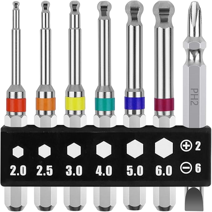 OIENNI ボールポイント 六角ビットセット 7本組 65mm 片頭 6.35mm六角軸 磁気ドライバービット 対辺2/2.5/3/4/5/6 電動ドライバー用 (65mm 7本組)