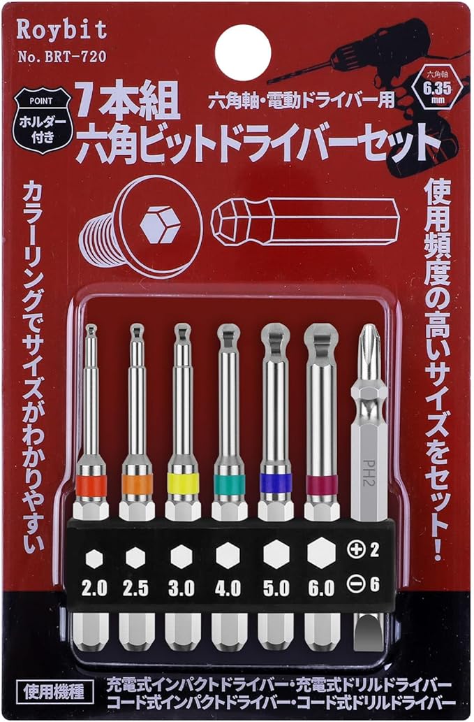 【商品仕様】サイズ:対辺2/2.5/3/4/5/6 65mm(ボールポイント六角ビット各1本)、+2/-6 65mm(双頭ビット1本)。セット内容:7本組。シャンク径:6.35mm。素材:クロムバナジウム鋼。硬度:HCR60 。