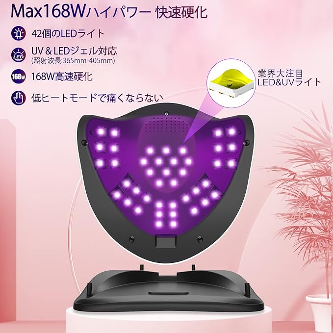 【UV/LED二重光源搭載し&168Wで高速硬化可能】 ジェルネイル用ライトは42枚最速のUVとLEDダブル光源技術を採用して、「ドーム型」180度ムラなく全方位で照射し、爪の側面までしっかり硬化することができて、硬化スビートは従来より速くとなります。硬化のしやすさは、光が満遍なく当たることが重要といえます。