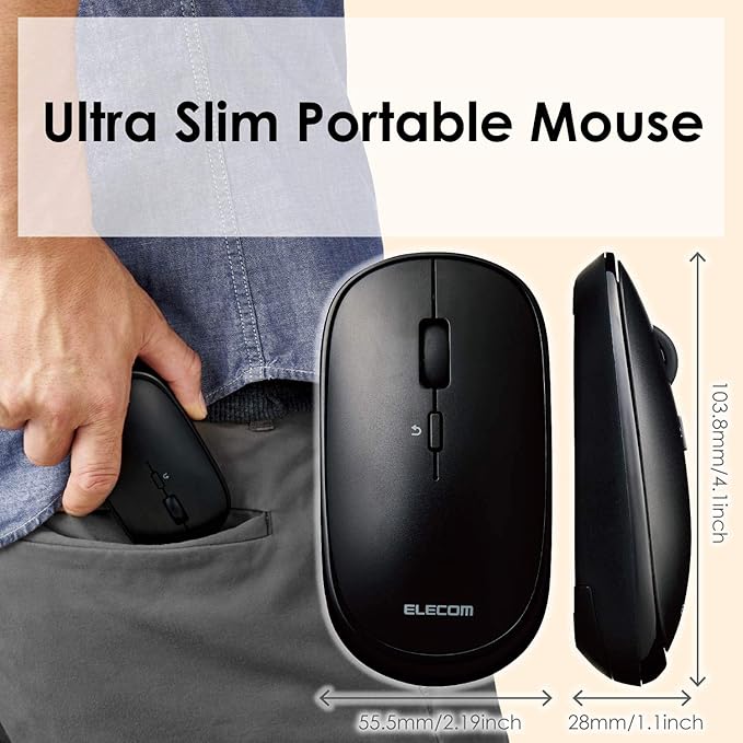 商品(左): カバンに入れて持ち運びしやすい厚み28mmの薄型マウスです。