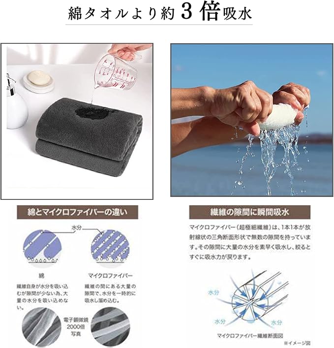 【安定した吸水力】毛髪の1/100の超極細繊維(マイクロファイバー)が毛細血管現象で水分を素早い吸収します。一般的なタオルと比べて、吸水力は何倍以上。体はゴシゴシではなく、髪や肌にそっと当てるだけで水分が吸収されます。汚れも落としやすいです。