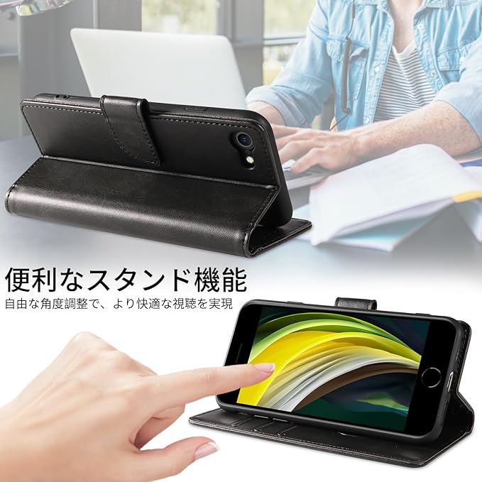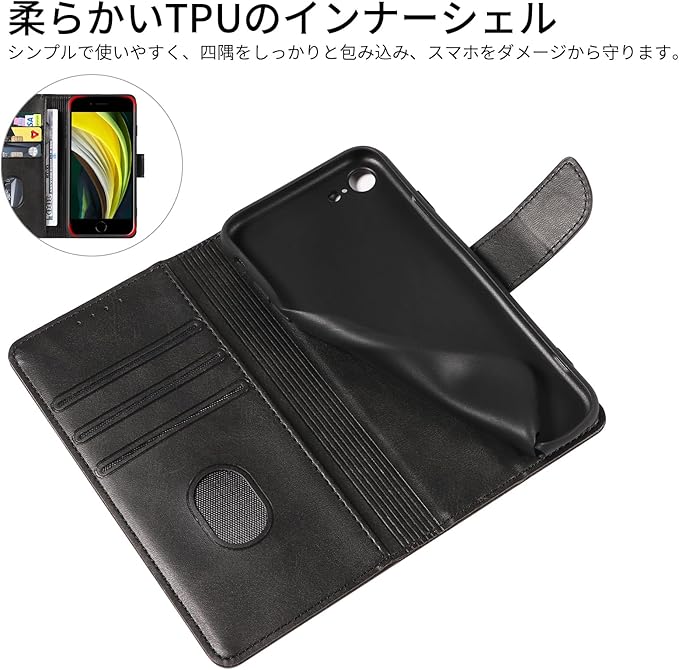 PinLiSheng iPhone SE ケース 手帳型 第2世代 第3世代 スマホケース iPhone 8 7 携帯カバー レザー 軽量 薄型 耐衝撃 耐摩擦 全面保護 マグネット式 カード収納 スタンド機能 4.7インチ対応,黒