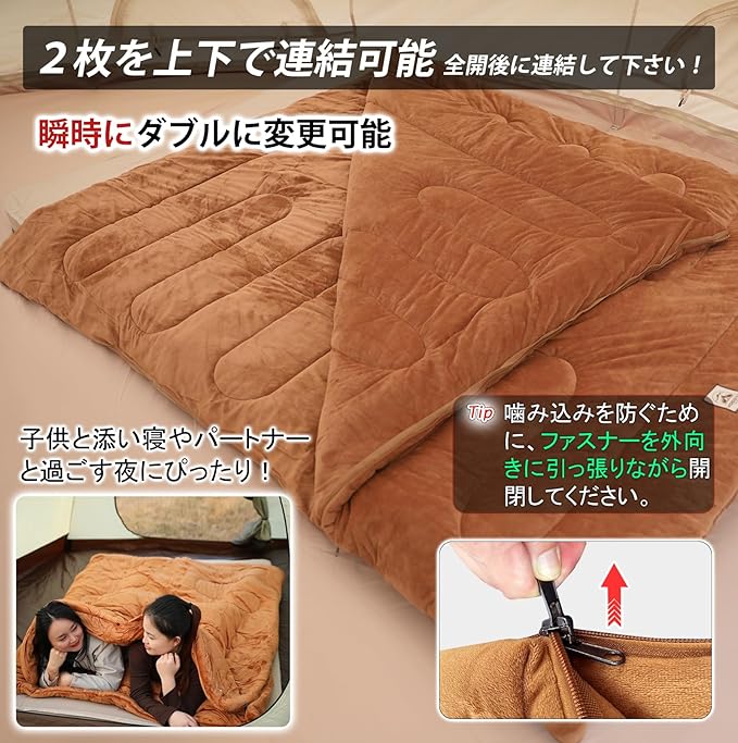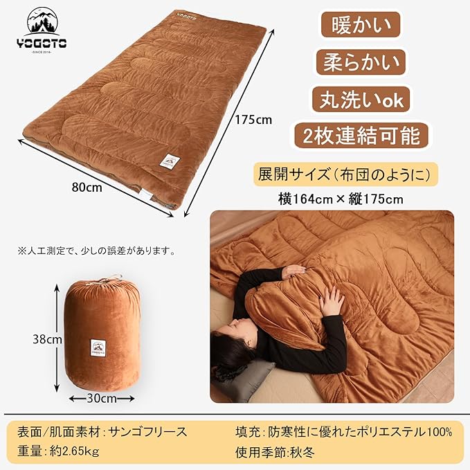 YOGOTO 冬用シュラフ 暖かい 連結可能 サンゴフリース寝袋 柔らかい 封筒型 丸洗いOK 厚手 くり色 ふかふか 収納袋付き キャンプ アウトドア 車中泊り