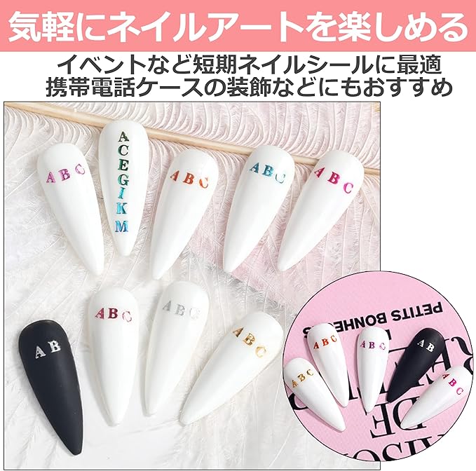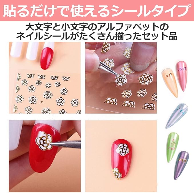 アルファベットのネイルシール:大文字と小文字のアルファベットのネイルシールがたくさん揃ったセット品です。貼るだけで使えるシールタイプのネイルパーツですので、気軽にネイルアートを楽しみたい方にもピッタリです。