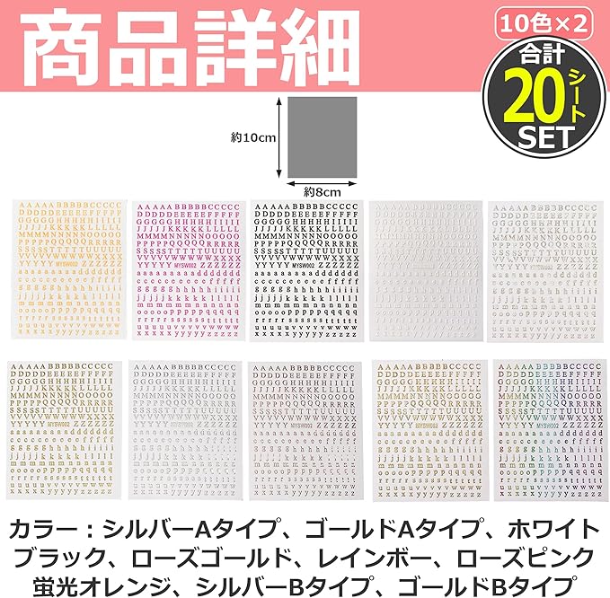 セット内容:各色 2シートセット(合計20シートセット) カラー:シルバーAタイプ、ゴールドAタイプ、ホワイト、ブラック、ローズゴールド、レインボー、ローズピンク、蛍光オレンジ、シルバーBタイプ、ゴールドBタイプ シートサイズ:約8 10cm ※モニターの環境等により、色の見え方に若干差が生じる場合がございます。