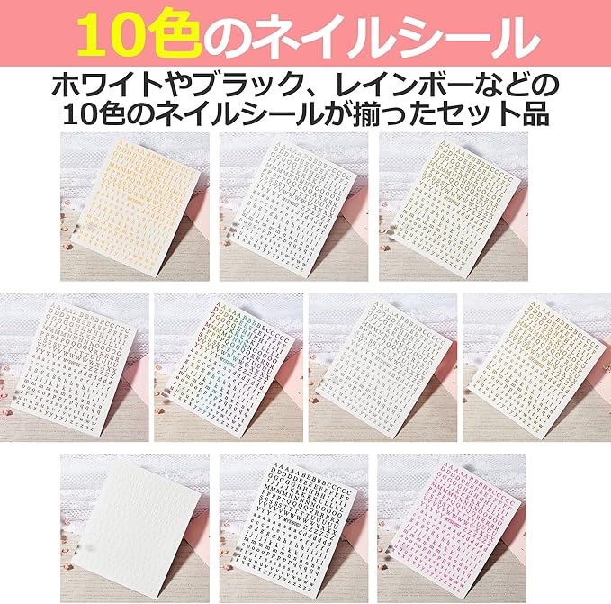10色のネイルシールが揃ったセット:ホワイトやブラック、レインボー、ローズゴールドなどの全部で10色のネイルシールが揃ったセット品ですので、各指で使用するネイルシールの色を変えたり、その日のコーディネートに合わせてネイルシールを使い分けたりすることもできます。