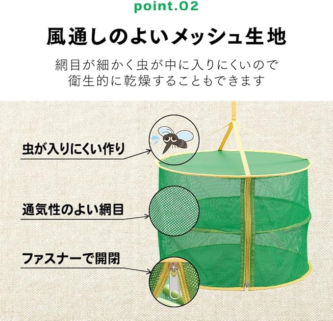 【風通しのよいメッシュ生地】通気性のよい網目が細かく虫が中に入りにくいので衛生的に乾燥することもできます。ファスナー仕様なのでラクラク開閉。