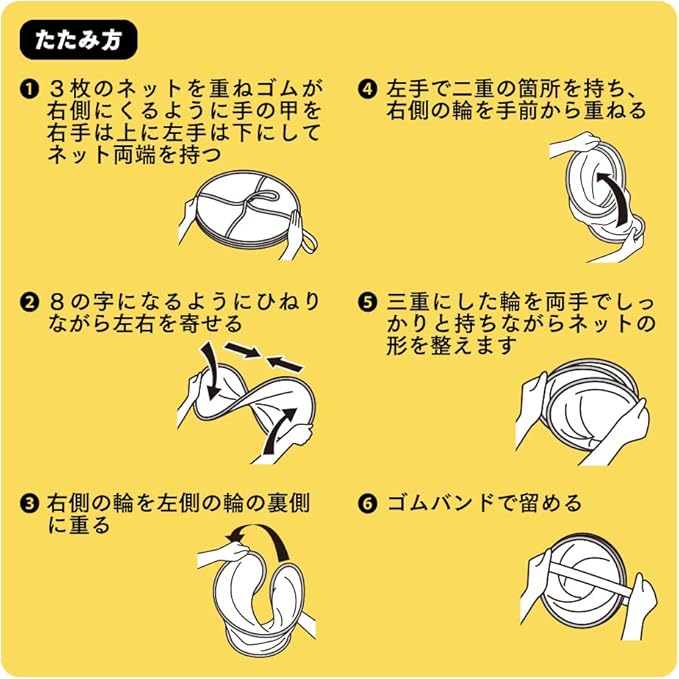【ねじってたたんでコンパクト収納】使わない時は小さくたためるので収納スペースを確保できます。●ひろげ方:①三重になっている本体をしっかり持ち、袋から取り出す。②本体をしっかり持ち、ゴムバンドを外す。③本体を両手でしっかり持ち、周囲に何もないのを確認して、顔から離した位置でゆっくり広げる※本品を広げる際にフレームのバネの力で勢いよく広がりますので、注意してください。●たたみ方:①3枚のネットを重ねゴムが右側にくるように、手の甲を右手は上、左手は下にして、ネットの両端を持つ。②8の字になるように、ひねりながら左右を寄せる。③右側の輪を、左側の輪の裏側に重ねる。④左手で二重になった所を持ち、右側の輪を手前から重ねる。⑤三重になった輪を両手でしっかりと持ちながら形を整える。⑥ゴムバンドで留める。