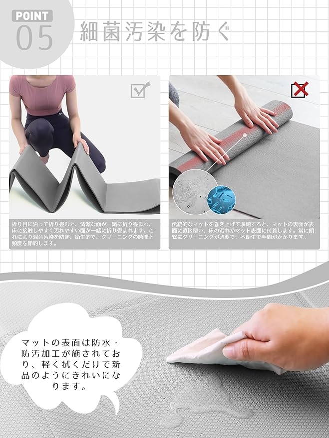 【細菌汚染を防ぐ】細菌汚染を防ぎ、従来の丸めたヨガマットよりも頻繁に掃除する手間が省けます。