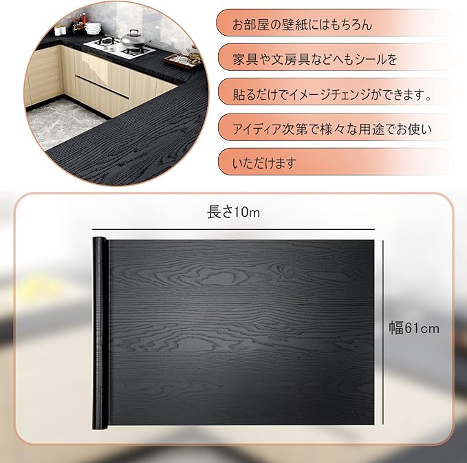 壁紙 黒 木目 厚手 はがせる 壁紙シール 60cmX10m リメイクシート 黒 木目調 カッティングシート 剥がせる壁紙 つや消し エンボス木目調 防水 簡単 diy ドア テーブル 扉 リフォーム 賃貸OK