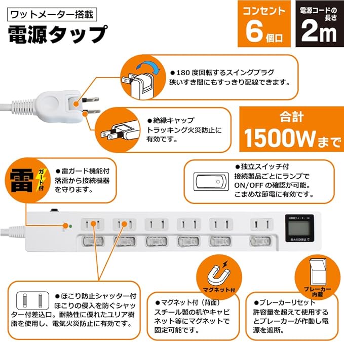 STYLED ワットメーター付き 個別スイッチ 電源タップ 2m 延長コード 18ヵ月保証 ACコンセント 6個 雷ガード 1500W (コンセント6口・ ホワイト・1個・コード2m)