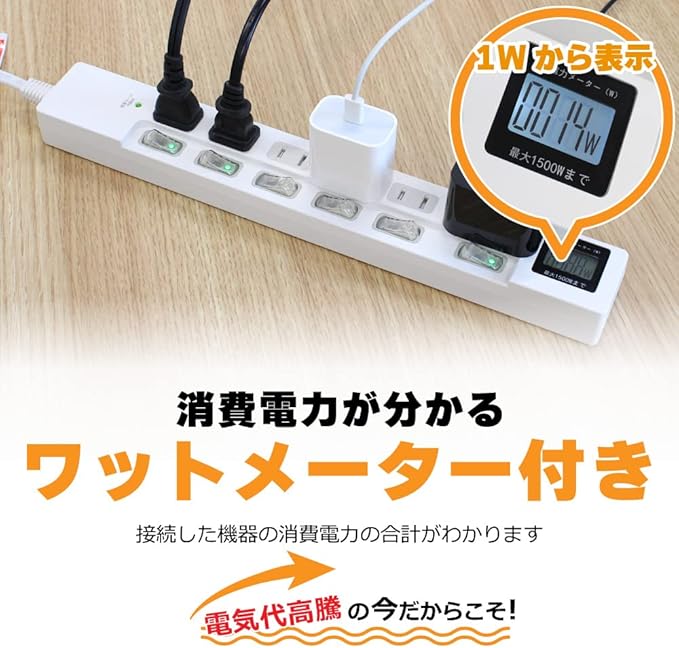 【ワットメーター付き】接続した機器の消費電力の合計がリアルタイムで分かります。