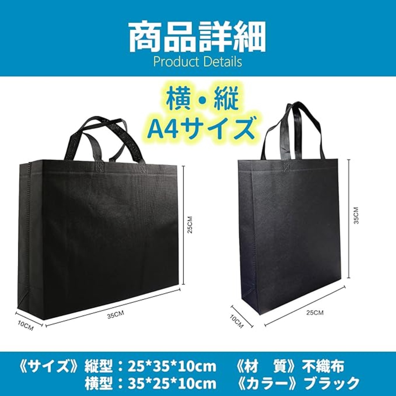 不織布バッグ縦型10枚と横型10枚のセットです。シンプル不織布トートバッグですので、買い物袋・手さげ袋・エコバッグ・ショップ袋・ギフト袋・書類入れ・備品の持ち運び用・演奏会の衣装入れ・靴を入れる持ち運び用・スリッパ入れ・室内室外シューズバッグなど色々なシーンに使いやすいバッグとなっております。複数入っているため、幼稚園・小学校・中学校・高校・大学などの学生のクラス単位でもお使いいただけます。