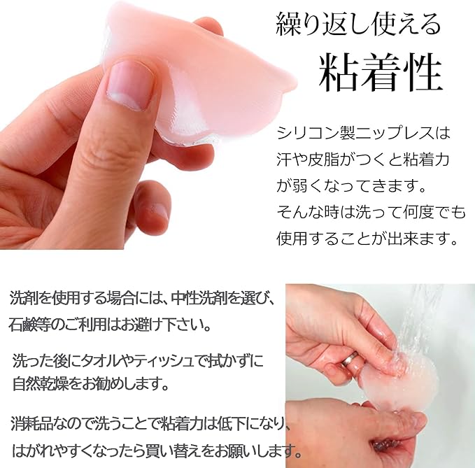 【繰り返し使える】シリコン製ニップレスなので何度も洗っても粘着力が落ちずに使用可能な設計にいたしました。デザインが花形と丸形2種類あります。その日その日で分けてお使いになれます。ただし徐々に粘着力は落ちていきます(使い方によります)。●お届け時に接着している透明フィルムは、未使用時の保護に使いますので大事に保管ください。
