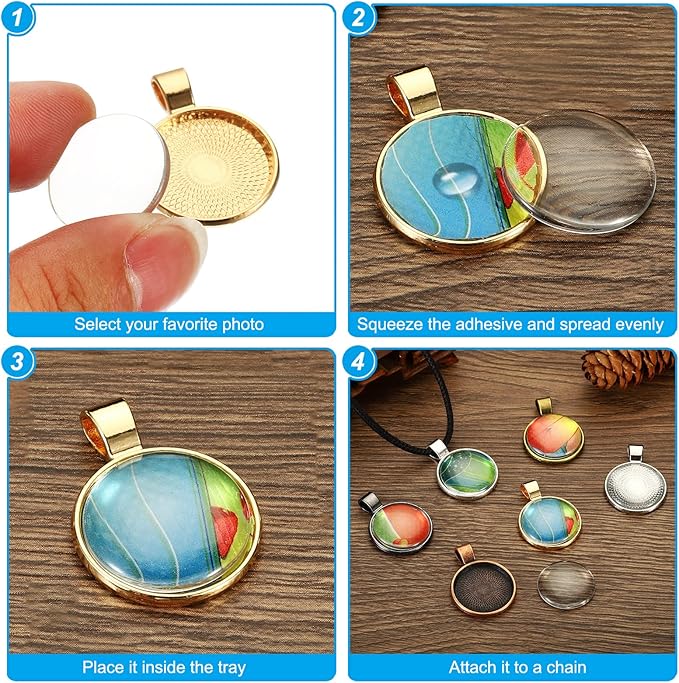 説明:各セットには、ベゼルペンダントトレイと、内側にぴったりフィットするお揃いのガラス半球が付属しています。お気に入りの写真やデザインを挿入し、写真の裏側に接着剤を絞り、均等に広げてトレイの内側に置き、貼り付けるだけです。チェーンやコードを使用して、ユニークでパーソナライズされたネックレスやペンダントを作成します。