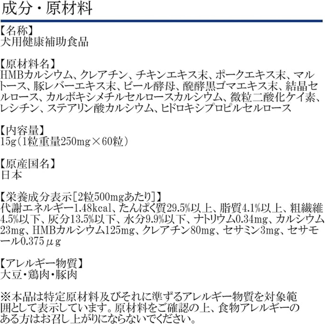 【原材料名】HMBカルシウム、クレアチン、チキンエキス末、ポークエキス末、マルトース、豚レバーエキス末、ビール酵母、醗酵黒ゴマエキス末、結晶セルロース、カルボキシメチルセルロースカルシウム、微粒二酸化ケイ素、レシチン、ステアリン酸カルシウム、ヒドロキシプロピルセルロース