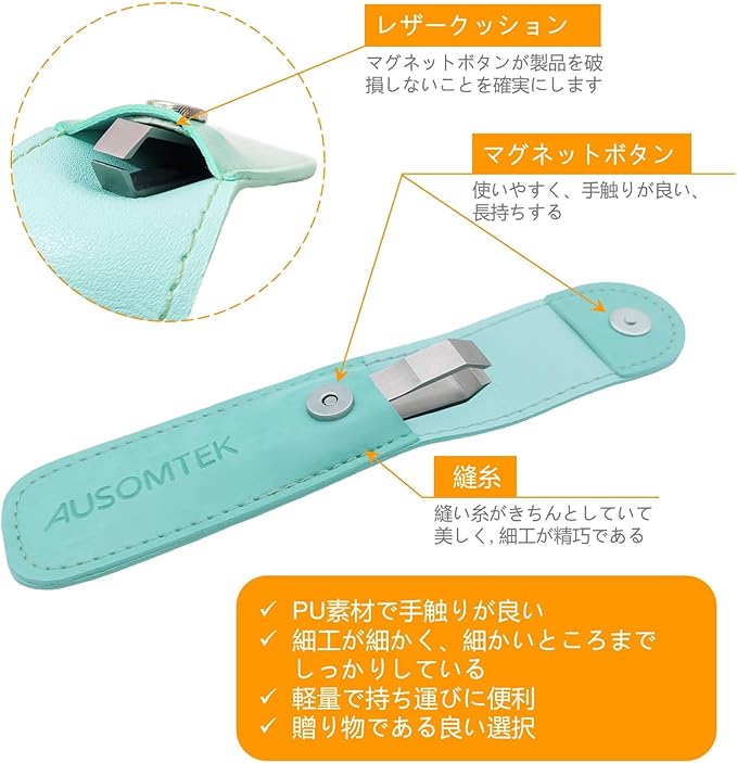 AUSOMTEK ヒゲピンセット 髭抜き 毛抜き 白髪抜きピンセット ステンレス製 細毛ピンセット 眉毛ツール 10mm精密先幅 滑り止めスロットデザイン シアン PU ケース (1個入)