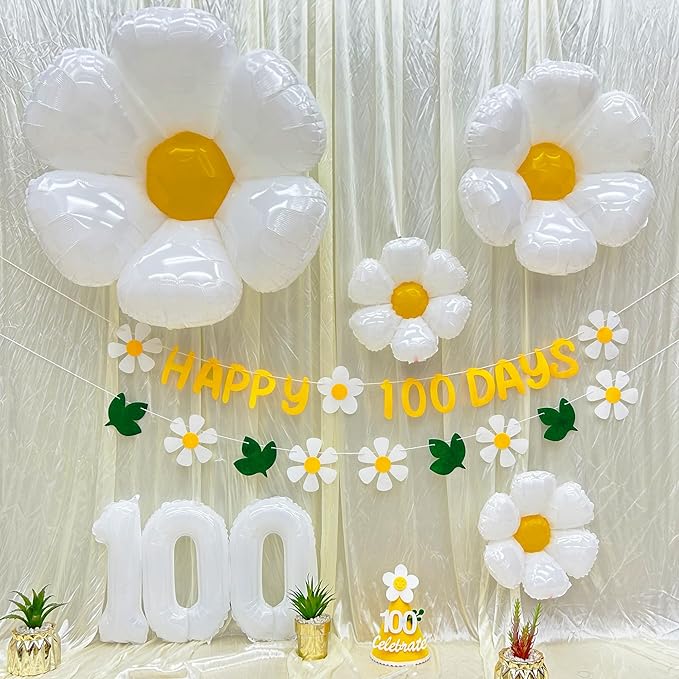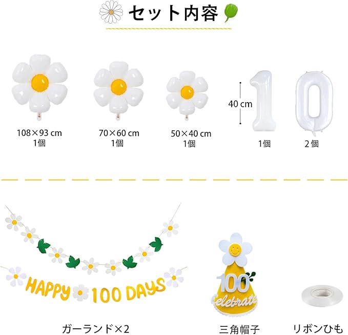 【セット内容】①フェルト布ガーランド 2 ②デイジーバルーン 4 ③数字バルーン[100] ④三角帽子 1 ⑤リボンひも (10m)